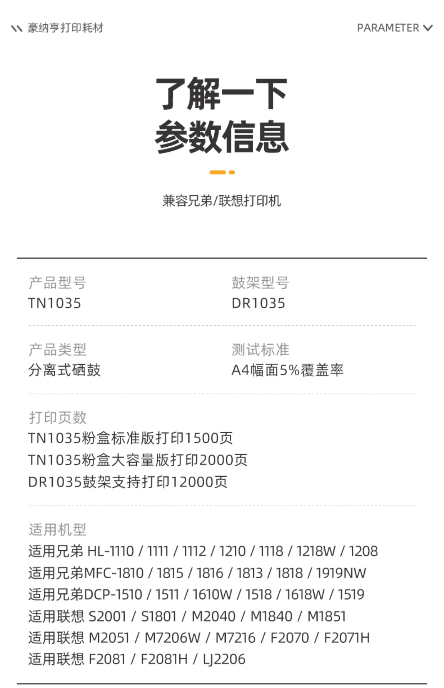 適用機型  :   適用兄弟dcp1618W打印機硒鼓tn1035粉盒1608 1619 1518 1813 1519 HL1208 1218 1118聯(lián)想m7206w LT201h墨盒
