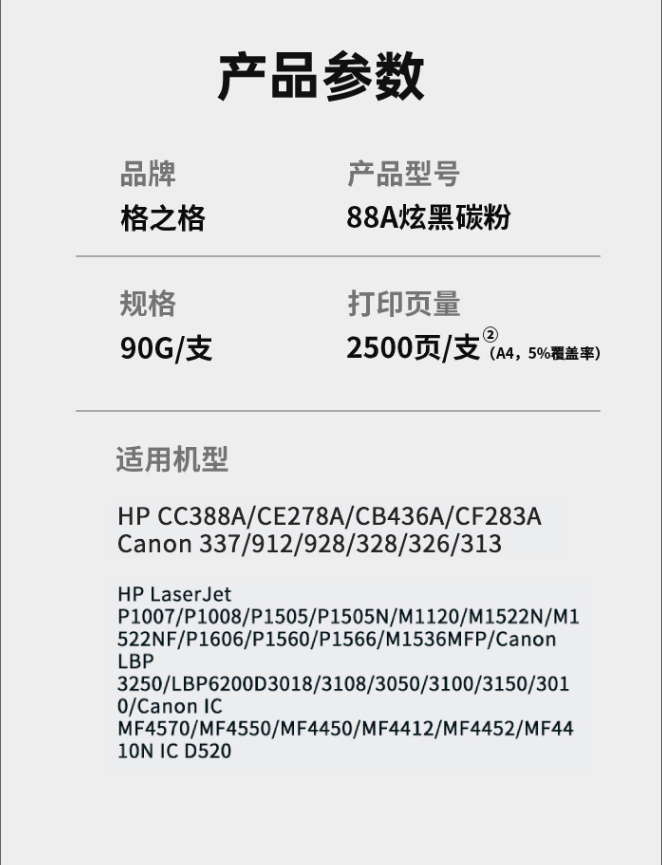 適用機(jī)型  :   HP CC388A/CE278A/CB436A/CF283ACanon337/912/928/328/326/313 HP LaserJetP1007/P1008/P1505/P1505N/M1120/M1522N/M1522NF/P1606/P1560/P1566/M1536MFP/CanonLBP3250/LBP6200D3018/3108/3050/3100/3150/3010/CanonICMF4570/MF4550/MF4450/MF4412/MF4452/MF4410NIC D520